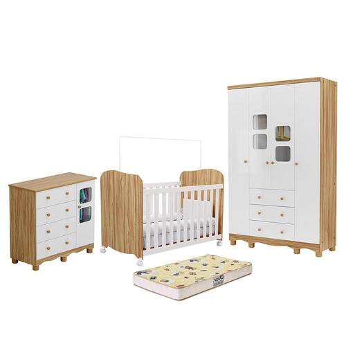 Dormitório Uli Guarda Roupa 4 Portas, Cômoda e Berço com Colchão Supreme - Móveis Peroba