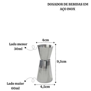 Informações Técnicas: Composição: Inox. Capacidade: 30/60ml Altura:9,5cm. Diâmetro do dosador maior: 4,5cm Diâmetro do dosador menor: 4,0cm. Peso:39gramas. Validade: Indeterminada.