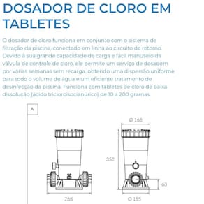 Dosador de cloro em tabletes O dosador de cloro funciona em conjunto com o sistema de filtração da piscina, conectado em linha ao circuito de retorno. Devido à sua grande capacidade de carga e fácil manuseio da válvula de controle de cloro, ele permite um serviço de dosagem por várias semanas sem recarga, obtendo uma dispersão uniforme para todo o volume de água e um eficiente tratamento de desinfecção da piscina. Funciona com tabletes de cloro de baixa dissolução ácido tricloroisocianúrico de 10 a 200 gramas.