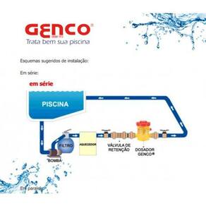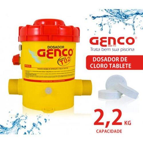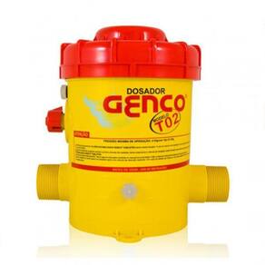 Dosador de cloro Tablete GENCO T02Dosador GENCO Modelo T 02 para GENCLOR Tabletes.O Dosador Genco modelo T 02 tem disposição para 2,2 kg de Cloro Estabilizado GENCLOR Tabletes de 20 ou 200 gramas . Os tabletes são alocados dentro do dosador, o qual é acomodado na tubulação de retorno da piscina, após filtro e aquecedor se houver . A água, depois de filtrada, passa pela camada inferior dos tabletes contidos na câmara do dosador e dilui parte destes, voltando, clorada à piscina, onde dissolve seu teor de cloro com o restante da massa aquática. A repetição sucessiva desse processo, enquanto a motobomba estiver ligada, mantém o residual de cloro da água no nível esperado pelo usuário.O dosador apresenta design em monobloco, compacto, e forte. É muito fácil de atuar basta remover manualmente suas tampas uma externa e outra interna e enchê-lo com GENCLOR Tabletes a determinados períodos, que podem ser dias, semanas ou meses, de acordo com o volume da piscina. Ele foi desenvolvido para permitir acomodação fácil e rápida, diretamente em tubulações plásticas de 1 1/2 polegadas, através de conexões plásticas com rosca, mesmo em casas de máquinas pequenas, tanto de piscinas residenciais como coletivas de até 160 m3.Especificações:1. Dimensões em mm2. Pressão máxima de operação: 6 Kgf/cm2 ou 87 PSI3. Dissolução máxima de Tabletes de cloro: 35 g/h ou 31,5 g de cloro ativo/hora 1, 2.4. Capacidade de tratamento estimada piscinas residenciais com até 160 m3 1.