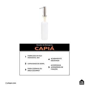 Com design moderno e discreto, o produto combina perfeitamente com os outros utensílios da cozinha, ocupando pouco espaço na bancada. Seu acionamento libera a quantidade ideal de detergente ou sabão para uso, evitando desperdícios e mantendo o ambiente sempre organizado.