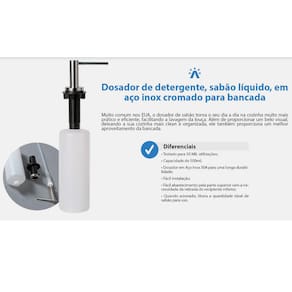 DOSADOR DS02 INOX ALTO BRILHO PORTA SABONETE LIQUIDO Muito comum nos EUA, o dosador de sabão torna o seu dia a dia na cozinha muito mais prático e eficiente, facilitando a lavagem da louça. Além de proporcionar um belo visual, ele também proporciona um melhor aproveitamento da bancada.DIFERENCIAIS:- Testado para 50MIL utilizações- Capacidade de 500ml- Dosador em Aço Inox 304 para uma longa durabilidade- Fácil instalação- Fácil abastecimento pela parte superior sem a necessidade da retirada do recipiente inferior- Quando acionado, libera a quantidade ideal de sabão para uso.Características:Marca: ArellModelo: ARE-DS02-ABMaterial do dosador: Aço Inox 304Material do recipiente: PolietilenoAcabamento: Alto brilhoInstalação: Tampo ou em cima da pia