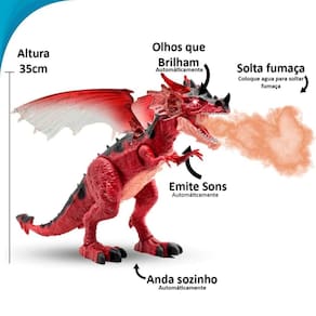 Características Anda sozinho com movimentos realistas Emite luzes coloridas e sons envolventes Solta fumaça pela boca para um efeito surpreendente Design detalhado e resistente Ideal para crianças a partir de 3 anos Presente criativo para aniversários e datas especiais