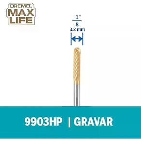 Ponta de esculpir de metal duro Dremel Max de forma cilíndrica com ponta redondaAcessório de esculpir de metal duro que oferece máxima durabilidade e desempenho duradouroFeito de aço temperado e revestido com Nitreto de titânio para durar 2 vezes mais do que a ponta padrãoUtilize em aplicações mais agressivas para moldar, alisar ou esmerilar materiais durosRemova material com precisão em materiais tais como metais, aço temperado, madeiras duras, cerâmica refratária e plásticosConteúdo: 1 ponta de esculpir de metal duro Dremel Max de 3,2 mm 9903HP Especificações técnicasDiâmetro da haste 3,2 mmDiâmetro de trabalho 3,2 mmComprimento do acessório 39,0 mmMaterial = Metal duro com revestimento de TINFormato = Ponta esféricaUso do mandril = Não requer um mandrilLargura 3,0 mmComprimento 3,0 mmAltura 39,0 mmrpm máxima 35.000 rpmDimensão C x L x A : 20 x 26 x 10cmPeso: 30g Marca: Não Informado