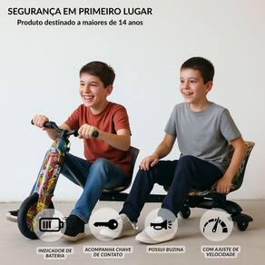 Que tal essa nova sensação que vai conquistar a criançada. O Triciclo Elétrico Drift da Importway possui potência de 350W e velocidade máxima de 25km/hr. Agora seu filho poderá sentir a adrenalina de um verdadeiro piloto com muita emoção. Possui freio dianteiro, além de luz de LED, deixando a brincadeira ainda mais radical.