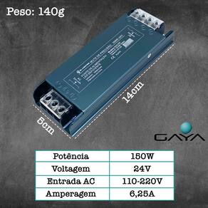 Potência: 150W Tensão de Saída (DC): 24V Corrente de Saída: 6,25A Entrada AC: Bivolt (110V-220V) Peso: 140g Dimensões: 14cm x 5cm x 2,3cm