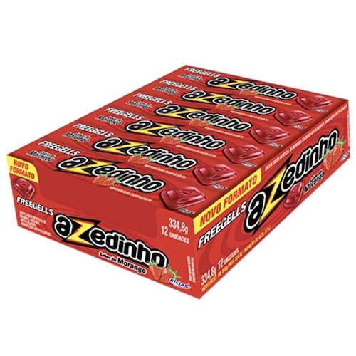 Caixa contendo 12 drops de bala Azedinho Morango Freegells com 27,9 gramas cada. Peso total da embalagem 334,8 gramas.