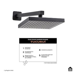 A Ducha Chuveiro Quadrado de Parede Tucuruí - Pingoo.casa - Preto oferece conforto e praticidade para o seu banho. Seu formato quadrado e os bicos de diferentes tamanhos garantem uma distribuição equilibrada da água, proporcionando tanto fluxos suaves quanto mais intensos. Essa tecnologia cria um efeito de "chuva natural", tornando o banho mais relaxante e eficiente. Com acabamento preto fosco, a Ducha Tucuruí é fácil de limpar e manter, adaptando-se a diversos estilos de banheiro com um toque moderno e sofisticado.