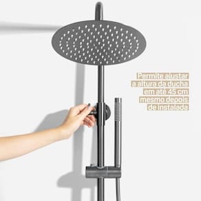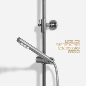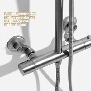 A Ducha Coluna de Inox redonda 25 cm, com acabamento escovado, monocomando, traz um novo conceito em banho vertical, unindo o design ergonômico e minimalista ao poder da água. Sua instalação é muito prática e pode ser feita em pouco tempo. Ela conta com chuveirinho de mão, sistema termostático e diversas regulagens para deixar a ducha perfeita na sua instalação. Conta com uma ducha de mão flexível, sendo possível regular a direção e altura da base para o ângulo que melhor atenda suas necessidades, permitindo direcionar a água para áreas específicas do corpo, tornando o banho mais confortável e relaxante. A Ducha conta com um sistema de regulagem de altura, podendo variar da posição mais alta a mais baixa, cerca de 40cm.