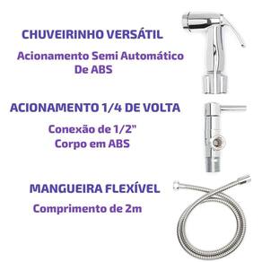 Ducha Higiênica C72 ABS Cromado Acionamento 1/4 de Volta Produzida toda em ABS, isso garante o preço em conta. O ABS é um plástico super resistente quimicamente, isso é não mancha e não enferruja, diferente do metal, que por sua vez não tem o acabamento tão resistente quanto. DIFERENCIAIS DA DUCHA Acionamento com apenas 1/4 de volta, maior controle sobre o consumo da água;Gatilho de acionamento inteligente, fácil de acionar;Conexão de 1/2, padrão na maioria dos locais;Super leve e resistente, não enferruja e não mancha;Tamanho minimalista, se adapta ao design do banheiro;Mangueira de 2 Metros, tamanho ideal.Especificações Técnicas:Produto: Ducha Higiênica C72 ABS Cromado Acionmamento 1/4 de Volta;Material Corpo da Ducha: ABS Não Enferruja ;Material Volante Acionamento: ABS Não Enferruja ;Material Flexível: Metal Não Enferruja ;Material Gatilho: ABS Não Enferruja ;Conexão: 1/2;Instalação: Parede;Acionamento: 1/4 de Volta;Temperatura: 0C - 50C;Pressão Mínima: 2 MCA - 50 MCA;Marca: Dazie Metais;Garantia: 3 Meses; Marca: Dazie Metais