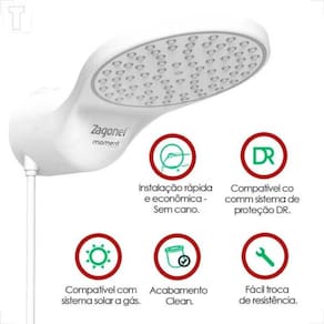 Ducha Moment Eletronica 7500w X 220v - Zagonel Com design moderno e linhas que remetem a identidade da Zagonel, a ducha Moment possui temperatura progressiva e jato com grande vazão de água, foi pensada para proporcionar uma experiência de banho relaxante e revigorante para todos os momentos do seu dia. 220v - 7500W ** Preço do produto em PC **