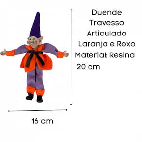 Duende Travesso 20 Cm Em Resina - Escolha a Cor O Duende Travesso da Bialluz é um ser muito puro e cheio de alegria, ele tem a capacidade de atrair boas energias e possui a virtude de converter uma situação desfavorável em favorável, afastando influencias negativas. Confeccionada em resina nossa escultura tem alta durabilidade e detalhes muito bem feitos que compõem a belíssima qualidade dessa peça. Escolha uma das cores disponíveis na opção COR do próprio anúncio Enviamos a sua escultura em até 24 horas após a confirmação de pagamento! Especificações técnicas: Altura: 20 cm Largura: 4 cm Comprimento: 15 cm Peso: 65 gramas Material: Resina Por ser uma peça feita artesanalmente e pintada à mão podem ocorrer pequenas variações nas cores ou tamanhos. Caso tenha alguma dúvida nos mande mensagem que respondemos rapidinho para te ajudar da melhor forma possível! Marca: META ATACADO