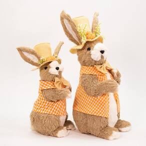 Dupla Coelho da Páscoa Laranja com Chapéu e Flores Enfeite -