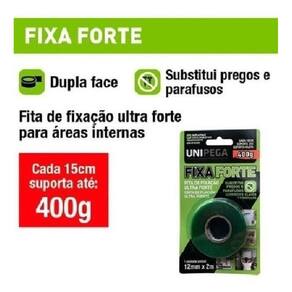 ----------------------------------- Araújo Gouveia Ferramentas ------------------------------------ Contém: - 01 Fita fixa forte 12mmx2mm Detalhes Técnicos: - Cor: Transparente - Cada 15 cm suporta até 400g - Fixação extrema e permanente - Substitui o uso de pregos e parafusos - Aplicação rápida, fácil, segura e limpa - Ideal para áreas internas e externas Atenção: - Não sobrepor pedaços de fitas. - Não aplicar em locais com solventes. - Não é recomendada usar em papéis de parede ou outras superfícies delicadas ou recém pintadas. - A fita só terá 100% de sua capacidade de carga após 48h. Características: - A Fita Fixa Forte é ideal para ser usadas na fixação de quadros, porta-chaves, espelhos, objetos de decoração, canaletas e muitas outras aplicações. - Sua aplicação é rápida, fácil, segura e limpa, evitando a perfuração de superfícies. - Pode ser aplicada em qualquer superfície lisa, como paredes, acrílicos, vidros, plásticos, metais, madeiras com verniz ou pintadas e revestimentos, em ambientes internos. Obs: Não amarela com o passar do tempo. ------------------------------------------------------------------------------------------------- Imagens Meramente Ilustrativas O design do produto não interfere em sua funcionalidade Os produtos podem sofrer alterações no design pelo fabricante ------------------------------------------------------------------------------------------------- ------------------------------------------------------------------------------------------------- Dúvidas Frequentes ------------------------------------------------------------------------------------------------- 1 - Os produtos são novos R: Todos os produtos na Araújo Gouveia Ferramentas são produtos novos e com . 3 - Como são realizadas as entregas R: Sim, nos anúncios que exibirem essa opção. 5 - Os produtos possuem ------------------------------------------------------------------------------------------------- Marca: Não Informado Ean: 7898652121272