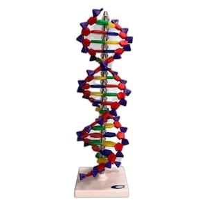Modelo didático, mostra estrutura molecular de dna, composto por três espirais de hélice dupla, constituído de ácidos codificado por cores para representar as bases de nitrogênio e as partes de fosfato piramidais e de açúcares pentagonais.