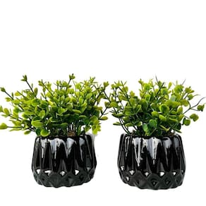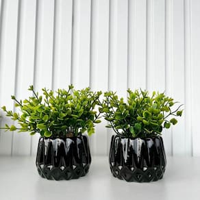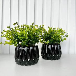 Decoração enfeite sala rack estante dupla vaso cachepot preto de cerâmica com textura gométrica trabalhado 3D com arranjo planta artificial.