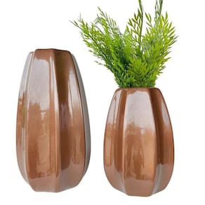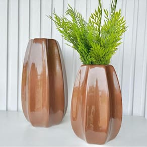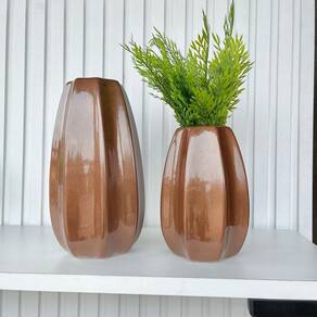 Decoração sala rack aparador dupla vaso centro de mesa grande e médio de cerâmica moderno trabalhado alto relevo na cor cobre decoração luxo com planta artificial.