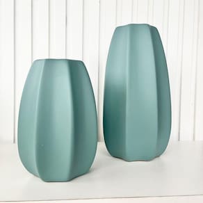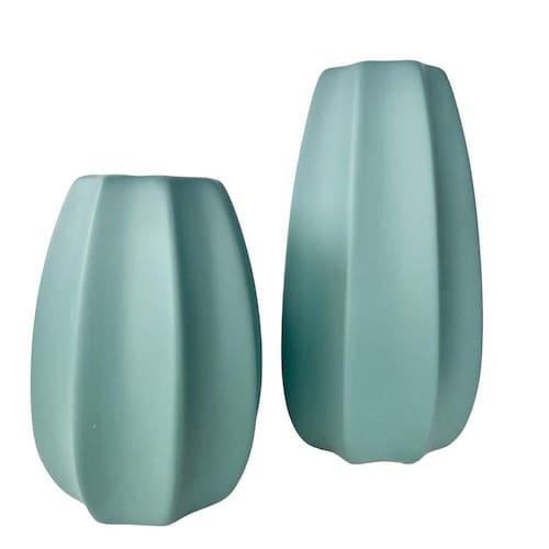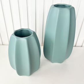 Decoração sala rack aparador dupla vaso centro de mesa grande e médio de cerâmica moderno trabalhado alto relevo na cor verde menta decoração luxo.