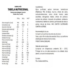 Ingredientes: água purificada, açúcar demerara, isomaltulose palatinose tm , d-ribose, taurina, citrato de sódio, carboximetilcelulose, cálcio citrato malato, ácido ascórbico, dimagnésio malato, citrato de potássio, sorbato de potássio, benzoato de potássio, piridoxina, nicotinamida, riboflavina, tiamina, pantotenato de cálcio e aroma natural de limão. Não contém glúten.Não contém lactose.