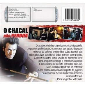 Dvd O Chacal Não Perdoa Os Salões de bilhar americanos estão fervendo. Jogadores profissionais, os mestres dos tacos, disputam milhares de dólares em partidas cujas apostas são milionárias. Nos bastidores todos tramam contra todos. Golpear é a estratégia certa, usada no momento certo para aniquilar o inimigo e embolsar a aposta. É neste clima de disputa constante que Joe, Mike, Danny e Brad vão se enfrentar numa partida emocionante repletas de jogadas sensacionais. Serão momentos nervosos de muita tensão. Para se ganhar vale tudo! Ficha Técnica Companhia Produtora do Filme: Europa Filmes Diretor do Filme: MARS CALLAHAN Físico/Digital: Físico Gênero: Drama Idioma das Legendas: Inglês e Português Idioma do Áudio: Português, Inglês Inclui extras: Sim País de Origem: Brasil Resolução de Vídeo: Full-screen Áudio: Dolby Digital 2.0