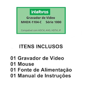 Itens inclusos 01 dvr intelbras mhdx 1104-c multi hd gravador de vídeo 4 canais 01 mouse usb 2.0 01 fonte de alimentação 01 guia de usuário