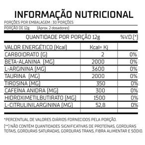 Beta Alanina 2.000mg : Ajuda a retardar a fadiga muscular, permitindo que você treine por mais tempo e com mais intensidade. Arginina 3.600mg : Com uma dose altíssima, a Arginina promove a vasodilatação, aumentando o fluxo sanguíneo para os músculos e melhorando a entrega de nutrientes essenciais durante o treino. Taurina 2.000mg : Essencial para a saúde cardiovascular e função muscular, a Taurina também pode aumentar a resistência e reduzir a fadiga durante o exercício. Tirosina 350mg : Ajuda a melhorar o foco, concentração e alerta mental, mantendo você motivado e engajado em seu treino. Cafeína Anidra 300mg : A forma purificada e altamente concentrada de cafeína aumenta a energia, o foco e o desempenho físico, mantendo você alerta e motivado durante todo o treino. HMB 1. Citrulina 52,8mg : Contribui para a produção de óxido nítrico, promovendo uma melhor vasodilatação e aumentando o fluxo sanguíneo para os músculos.