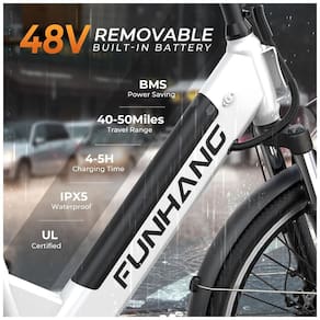 BATERIA INTERNA REMOVÍVEL DE GRANDE CAPACIDADE: As bicicletas elétricas Funhang de 26" para adultos são alimentadas por uma bateria interna removível de 48 V e 374,4 Wh, com certificação UL, proteção BMS, proteção IPX5 à prova d'água e antirroubo. Os ciclistas podem percorrer uma autonomia de 40 a 48 km no modo acelerador e de 64 a 80 km no modo pedal assistido, dependendo do peso, das condições da estrada e do estilo de pilotagem. O design removível garante máxima conveniência, permitindo que você carregue sem esforço em casa ou no escritório.