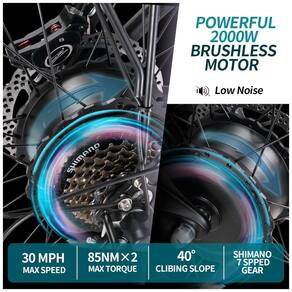 1. Bicicleta elétrica com motor duplo de 2000 W para adultos. Motores duplos sem escovas de 1000 W impulsionam esta e-bike de alta velocidade a 50 km/h. Alterne entre os modos de motor duplo/único para controle de velocidade ou maior alcance.