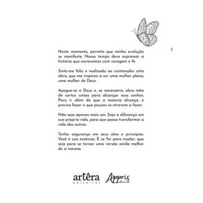 Neste momento, permito que minha evolução se manifeste. Nosso tempo deve expressar a história que escrevemos com coragem e fé. Sinto-me feliz e realizada ao contemplar esta obra, que me inspirou a ser uma mulher plena, uma mulher de Deus. Apegue-se a Deus e, se necessário, abra mão de certas coisas para alcançar seus sonhos. Para ir além do que a maioria alcança, é preciso fazer o que poucos se atrevem a fazer. Não seja apenas mais um. Seja a diferença em sua própria vida, para que possa transformar a vida dos outros. Tenha segurança em seus atos e princípios. Você é sua essência. E se for para mudar, que seja para se tornar uma versão ainda melhor de si mesma. Marca: ARTERA EDITORA