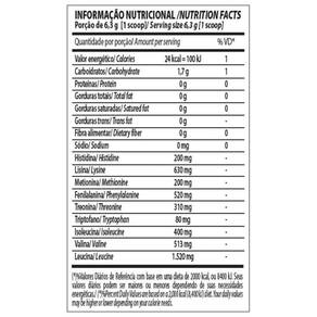 Ingredientes: Leucina, cloridrato de lisina, valina, fenilalanina, isoleucina, treonina, metionina, histidina, Lcitrico, edulcorantes naturais estévia e taumatina, e antimectante dioxido de silicio. não contém gluten.
