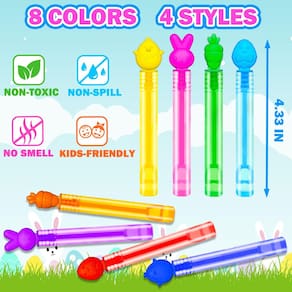 - Bolhas festivas de Páscoa – Conjunto de 32 varinhas de bolhas projetadas para coelho, ovo, frango e cenoura em 8 cores vibrantes. Com 4 varinhas por cor, este conjunto garante diversão borbulhante para celebrações de Páscoa!