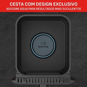 Diferente das air fryers convencionais, seu cesto de 6L exclusivo permite adicionar água, apresentando resultados ainda mais suculentos. O visor transparente com luz interna facilita o acompanhamento do preparo sem precisar abrir a gaveta, e os 12 programas automáticos oferecem praticidade e versatilidade para diversas receitas.