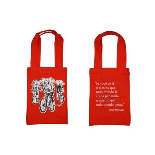 Cor vermelha, 100% algodão, alça de 25 cm, com dois bolsos internos, sendo um com zíper. Desenho "Elefantes de bicicleta", frase de Haruki Murakami. Marca: Não Informado