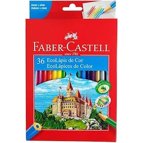 O produto consiste em um conjunto de 36 lápis de cor EcoLápis da marca Faber-Castell, cada um contendo corpo em madeira e uma mina de cor distinta. O conjunto totaliza trinta e seis cores diferentes, distribuídas de forma organizada dentro da embalagem, que mantém as unidades protegidas durante transporte e armazenamento. Cada lápis possui comprimento e diâmetro padronizados, com corpo cilíndrico de madeira e mina de pigmento contínuo. Os lápis podem ser utilizados em superfícies de papel ou materiais similares, permitindo a aplicação da cor de forma uniforme e sem alterações estruturais do lápis. Não há mecanismos móveis, eletrônicos ou componentes adicionais além do corpo de madeira e da mina de cor. A embalagem do conjunto serve como suporte para manter as unidades agrupadas, proporcionando organização e acesso individual a cada lápis. O estojo ou caixa que acompanha os lápis permite que eles sejam armazenados ou transportados sem contato direto entre si, mantendo a integridade física de cada unidade.
