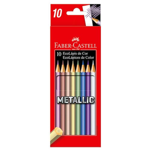 O conjunto de EcoLápis de cor Metallic, da Faber Castell, é fabricado em madeira de manejo florestal sustentável e certificado de alta qualidade para garantir durabilidade e resistência durante seu uso. Ideal para um traço colorido e rico em detalhes, conta com 10 cores metálicas, desenhando com maciez e um toque diferenciado para suas pinturas. As peças apresentam formato hexagonal para facilitar ainda mais seu uso. Uma escolha inteligente para quem busca versatilidade e beleza na volta às aulas.