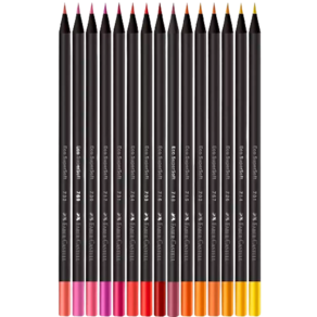 O estojo contém 15 cores quentes com excelente cobertura, sobre papéis claros e escuros.