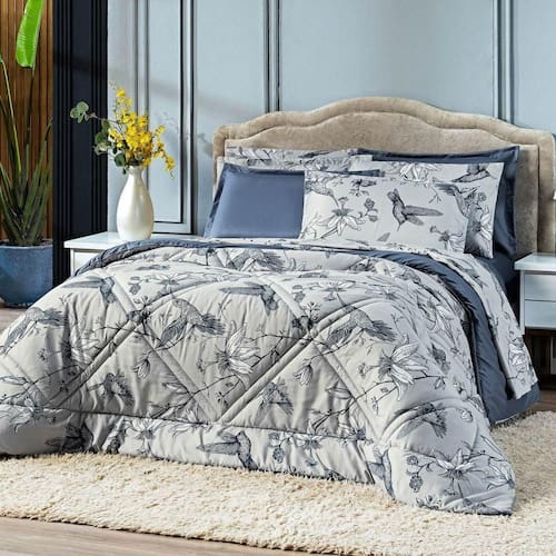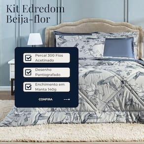 Transforme suas noites em uma experiência de conforto e estilo com o nosso Kit Edredom Beija-flor. Este conjunto irá transformar o seu quarto em um refúgio de tranquilidade e elegância. Feito com tecido em percal de 300 fios acetinado, este edredom é luxuosamente macio ao toque, proporcionando uma sensação de abraço aconchegante. Seu design dupla face oferece versatilidade, permitindo que você mude a decoração do seu ambiente com apenas um movimento. De um lado, um belo padrão de beija-flores em tons de azul e cinza, e do outro, uma elegante tonalidade sólida em azul petróleo liso, garantindo que seu quarto esteja sempre na moda. Além disso, o conjunto inclui dois porta travesseiros estampados combinando, completando o visual harmonioso do seu espaço de descanso. A estampa delicada de beija-flores traz um toque de natureza e serenidade ao seu ambiente, enquanto os tons suaves de azul e cinza adicionam sofisticação e tranquilidade. Prepare-se para noites de sono revigorantes e sonhos tranquilos com este kit. Transforme seu quarto em um santuário de conforto e beleza, onde você pode relaxar e recarregar suas energias. Confira!
