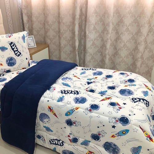 Sua estampa lúdica de astronauta desperta a imaginação e o desejo de explorar o universo. Além disso, a dupla face permite variar a decoração do quarto sempre que desejar, trazendo mais praticidade e versatilidade. Um edredom perfeito para envolver os sonhos em conforto e diversão!