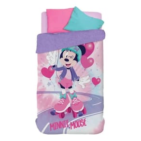 Edredom Infantil Solteiro com Sherpa Estampa Minnie 150x220 O edredom Sherpa Solteiro Estampado Minnie Lepper é perfeito para transformar o quarto das crianças em um ambiente cheio de encanto, estilo e conforto. Com dimensões de 150x220cm, ele oferece a medida ideal para camas de solteiro, proporcionando aconchego na medida certa. Estampando a adorável Minnie Mouse em um passeio encantador de patins, cercada por estrelinhas e corações, o edredom traz um toque de magia e alegria para a rotina dos pequenos. Possui dupla face, sendo um lado estampado e o outro com Sherpa, que garante um toque super macio, quentinho e confortável. Confeccionado em 100% poliéster e com gramatura de 382 g/m, é leve, fácil de lavar e altamente durável. Perfeito para noites mais frias, o edredom mantém o corpo aquecido com muito charme. Destaques do produto: