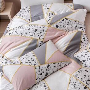 Disponível para camas: SOLTEIRO KING 1 edredom dupla face com enchimento 2,30x2,00cm - Frente estampa geométrica mista abstrata, tons De dourado, cinza, branco e rosê - Costas estampa abstrata fundo branco e estampa em cinza. 2 capas de travesseiros de 70cm x 50cm sem enchimento - Frente estampa geométrica mista abstrata, tons De dourado, cinza, branco e rosê - Costas estampa abstrata fundo branco e estampa em cinza.