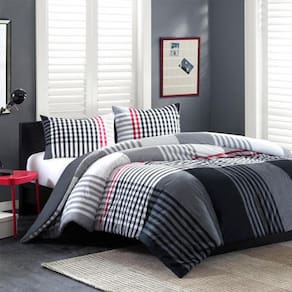 Disponível para camas: solteiro 1 edredom dupla face com enchimento 2,30x1,80cm - frente estampa geométrica mista abstrata, Tons de cinzas, branco e listras delicadas em vermelho ferrari - costas em cinza escuro. 2 capas de travesseiros de 70cm x 50cm sem enchimento - frente estampa geométrica mista abstrata, Tons de cinzas, branco e listras delicadas em vermelho ferrari