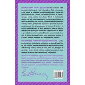 Educação como prática da liberdade foi escrito em 1967, durante o exílio forçado de Paulo Freire no Chile. Tem como principal objetivo alcançar a educação que liberta seres humanos da condição de oprimido e os insere na sociedade como forças transformadoras, críticas, politizadas e responsáveis por todas as pessoas que a integram. Além de apresentação de Francisco C. Weffort e prefácio-poema de Thiago de Mello, esta edição reúne apêndice com exemplos de situações existenciais, que possibilitam no Método a apreensão do conceito de cultura. São acompanhadas de desenhos de Vicente de Abreu feitos a partir das pinturas autênticos de Francisco Brennand, destruídas pela ditadura militar brasileira. Em 1963, em Angicos, interior do Rio Grande do Norte, trezentos trabalhadores rurais foram alfabetizados em apenas 40 horas, pelo método proposto por Paulo Freire. Esse foi o resultado do projeto-piloto do que seria o Programa Nacional de Alfabetização do governo de João Goulart, presidente que viria a ser deposto em março de 1964. Em outubro desse mesmo ano, Freire deixou o Brasil para proteger a própria vida. Apenas voltou a visitar o país em 1979, com a abertura democrática. Ao longo de sua história, Paulo Freire recebeu mais de cem títulos de doutor honoris causa, de diversas universidades nacionais e estrangeiras, além de inúmeros prêmios, como Educação para a Paz, da Unesco, e Ordem do Mérito Cultural, do governo brasileiro. Integra o International Adult and Continuing Education Hall of Fame e o Reading Hall of Fame. “Quando um ex-analfabeto de Angicos, discursando diante do presidente Goulart, que sempre nos apoiou com entusiasmo, e de sua comitiva, declarou que já não era massa, mas povo, disse mais do que uma frase: afirmou-se conscientemente numa opção. Escolheu a participação decisória, que só o povo tem, e renunciou à demissão emocional das massas. Politizou-se.”