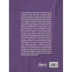 O livro Educação em prisões e universidades públicas no Brasil lança um olhar sobre os possíveis papéis exercidos e a serem construídos pelas universidades públicas brasileiras em relação às práticas e políticas de educação em espaços prisionais, fundamentando-se no conjunto de normas e iniciativas já existentes. A obra propõe-se a discutir os eixos ensino, pesquisa e extensão, e levantar debates em torno das potencialidades e possibilidades de se nuclear ações e construir melhores pontes entre universidade e prisão no Brasil, mirando para o desencarceramento e a ampliação do acesso a direitos a grupos historicamente excluídos e encarcerados no país. A autora retoma os resultados da sua pesquisa de doutorado concluída na USP, em 2017, cujo campo visou conhecer experiências de universidades públicas argentinas e brasileiras no sistema prisional e inspirar a elaboração de um mapa de encontros territoriais entre unidades prisionais e instituições de ensino, tendo a universidade pública como um possível polo de ações. Por seu conteúdo social e academicamente relevante, esta leitura torna-se uma fonte de reflexão e análise interdisciplinar a todas as pessoas que se interessam pelo direito à educação e pelo acesso a direitos na prisão, apesar dela.