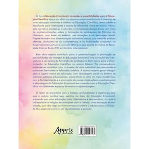 O livro Educação Emocional: conexões e possibilidades com a Educação Científica lança um olhar corajoso e comprometido com a inserção de uma educação amorosa e afetiva na Educação Científica, tema inédito e desafiante para instituições e atores de diferentes níveis de ensino. Assim, esta narrativa propõe-se a abordar a completude dessas áreas, por meio de problematizações sobre a formação de professores de Ciências da Natureza, com base na estética, nas emoções e no bem-estar social. Propõe também sua disseminação no ensino básico, por meio de práticas afetivas, alinhando-se às competências e às habilidades propostas na Base Nacional Comum Curricular (BNCC) e aos pilares do índice de Felicidade Interna Bruta (FIB) em âmbito internacional. Esta obra espera contribuir para a potencialização e de possibilidades de inserção da Educação Emocional nos currículos de licenciaturas e de cursos de formação de professores, bem como para a disseminação na Educação Científica no ensino básico. Por consequência, pretende-se contribuir com o projeto de vida individual dos estudantes e promover bem-estar e felicidade coletiva. A autora espera gerar indagações e sugerir meios de aplicação, com abordagem social no âmbito de políticas públicas educacionais, expandindo o tema no meio acadêmico, com o fortalecimento e a de novas construções conceituais para a abordagem da Educação Emocional em conexão com a Educação Científica nos diferentes espaços de ensino e aprendizagem. O leitor se encantará com a beleza, profundidade e esperança com que a autora conduz seus escritos na área da Educação Emocional, prezando por uma educação justa, libertadora e democrática, na qual é indissociável a relação das emoções com a ciência; uma educação humanizada, que não nega os novos tempos e encara o educar para a felicidade tão essencial como o ato de alfabetizar e calcular.