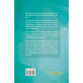 A obra traz reflexões para os pais acerca do direcionamento da educação dentro de casa. As crianças devem ser educadas para pensar por si mesmas, assim como ter responsabilidade sobre as próprias ações. Como educar sem utilizar palavras rudes? Como negar algo sem dizer “não”? Como integrar a criança às ocorrências do lar de forma dinâmica e divertida? Permeado pelas mensagens de Crescendo com Sabedoria, o livro ajuda os pais leitores a refletirem qual a melhor forma de educar os filhos, considerando sempre a linguagem do amor e da paciência. Cada criança é única, mas são os pais os responsáveis por iniciá-las no caminho do bem.