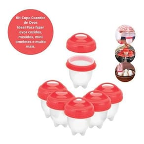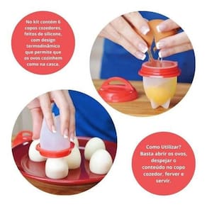 Egglettes 6 ovos copos forma cozinha copo Forma silicone com tampa para ovos cozidos e temperados Descrição do produto: - conjunto com 6 formas com de silicone com tampa para fazer ovos cozidos; Como utilizar: - o processo de cozimento é ao cozimento do ovo com a casca; - unte a forma de silicone com ou ; - quebre o ovo e coloque dentro da forma de silicone; - caso queira rechear ou temperar adicione os ingredientes na forma; - encha uma panela com água fria para que as formas não toquem o fundo da panela; - deixe ferver pro aproximadamente 10 minutos; - retire as formas da água com cuidado; - solte a tampa da forma e retire o ovo cozido virando a forma com a abertura para baixo; - caso seja necessário, utilize uma colher ou espátula para ajudar a soltar o ovos da parede interna da forma. Itens inclusos: - 6 formas de silicone para fazer ovos cozidos; - 6 tampas da forma de silicone Atenção: este produto não pode ser utilizado no forno ou microondas.