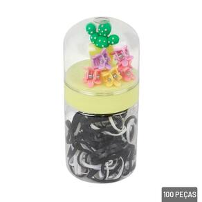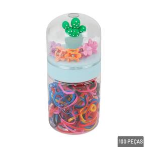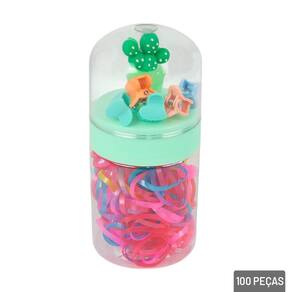Elástico de Cabelo 100 Peças Silicone e Pre Organização, estilo e praticidade em um único kit! Este conjunto traz 100 elásticos de cabelo em silicone de alta qualidade, armazenados em um pote plástico com tampa decorativa em formato de cacto, que além de funcional, é superfofo e ideal para manter tudo sempre organizado. Os elásticos são fabricados em silicone macio, flexível e resistente, garantindo fixação confortável e segura sem danificar os fios, sendo ideais para todos os tipos de cabelo, especialmente os mais delicados e finos.\nPara completar, o pote acompanha 5 presilhas coloridas, perfeitas para criar penteados variados, prender mechas com segurança e dar um toque extra de charme ao visual.\nDisponível em cores .\nAproximadamente 100 Unidades.\nEspecificações:\nMarca : TINGS\nTipo de material : Silicone, Plástico\nCores ou Estampa : Color\nDimensões do Produto : 12 X 5,5 X 5,5 CM\nDimensões da Embalagem : 12 X 5,5 X 5,5 CM\nPeso Bruto (Gramas) : 0.046 Marca: Não Informado