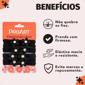 Elásticos De Cabelo Proat Flor Cor Preto Ec11b Os Elásticos de Cabelo Proart Preto Flor EC11B são perfeitos para prender os cabelos com firmeza, conforto e um toque de estilo. Com acabamento em tecido preto e detalhe em flor, eles unem praticidade e charme, sendo ideais para o uso diário ou para compor penteados mais elaborados. Feitos com material elástico resistente, não puxam nem quebram os fios, garantindo segurança e delicadeza ao prender o cabelo.