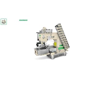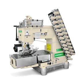 Material Leve, Médio e Pesado Motor Direct Drive Potência do Motor 550 W Tensão 220 V Velocidade 3.000 rpm Número de Fios 24 Fios Número de Agulhas 12 Agulhas Distância entre Agulhas 1/4" (6.4mm) Tamanho da Bitola 6.4 pol Tipo de Agulha UOx113 Número de Catracas 2 Lubrificação Automática Máquina Elastiqueira Sew Power SP-008-12064P-DS/S com 12 agulhas Direct Drive