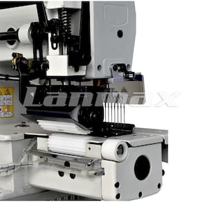 Elástiqueira Eletrônica Cilíndrica Direct Drive-eletronica pneumatica Posicionador de agulha, corte de linha, resfriador de agulha, levantamento de calcador e ajuste de comprimento de ponto fácil e rápido. Utiliza loopers independentes, permitindo mudar a posição das agulhas facilmente de acordo com aplicação da costura. Apropriado para aplicação de elástico, faixas refletivas, plissados, costuras de cós em bermudas e calças de sarja e brim e outros tipos de costura.